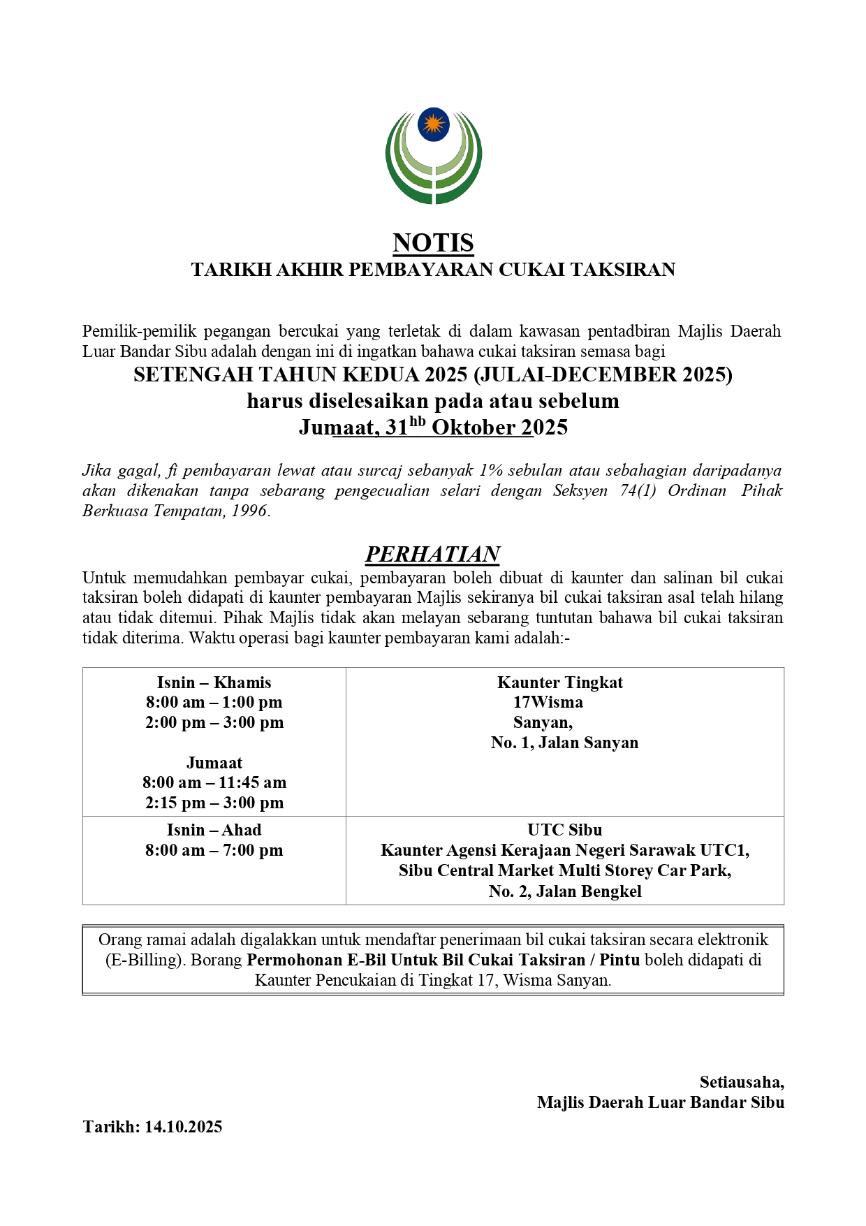 Tarikh Akhir Pembayaran Cukai Taksiran Setengah Tahun Kedua